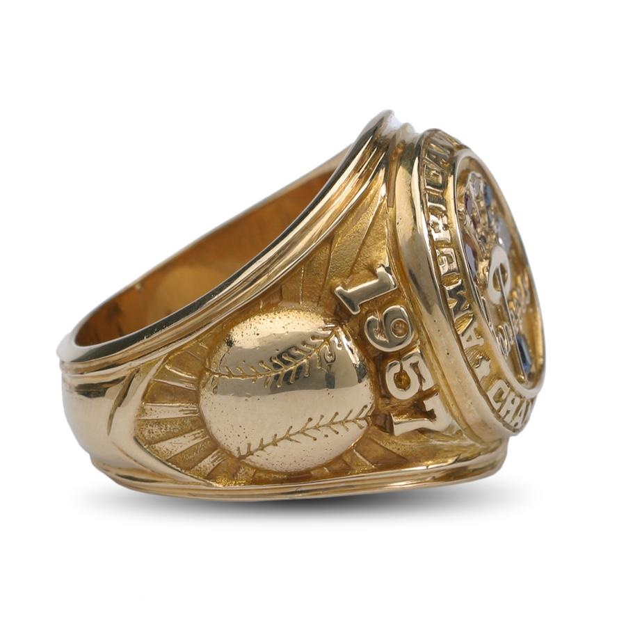 This ring, topped with rubies, sapphires, and cubic zirconias, is a sample ring which is identical to rings given to the players, and is pretty rare to see one of these from the 1950's. The ring is a 10K made by Balfour, and is a size 10.25. The inside has been engraved with, "8A 69698 - Bank". The face of the ring says, "Yankees, American League Champions". Each side of the ring says "1957", with a raised gold baseball underneath.