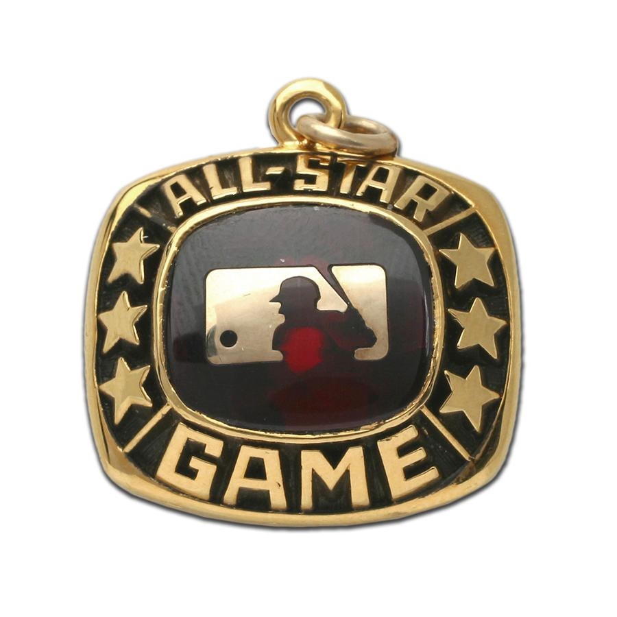 This All-Star charm is set against a ruby background, and features the outline of a player at bat in the middle. It says "All-Star Game" around the pendant, and is stamped with "HGE" on the back. This one has been attributed to George Hendrick, who was a notable key player with the 1982 St. Louis Cardinals World Series team. He is currently working as the first base and outfield coach for the Tampa Bay Rays. The pendant comes in a Balfour box, and has their logo on the back of the pendant, too.