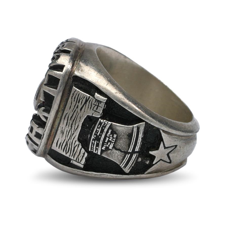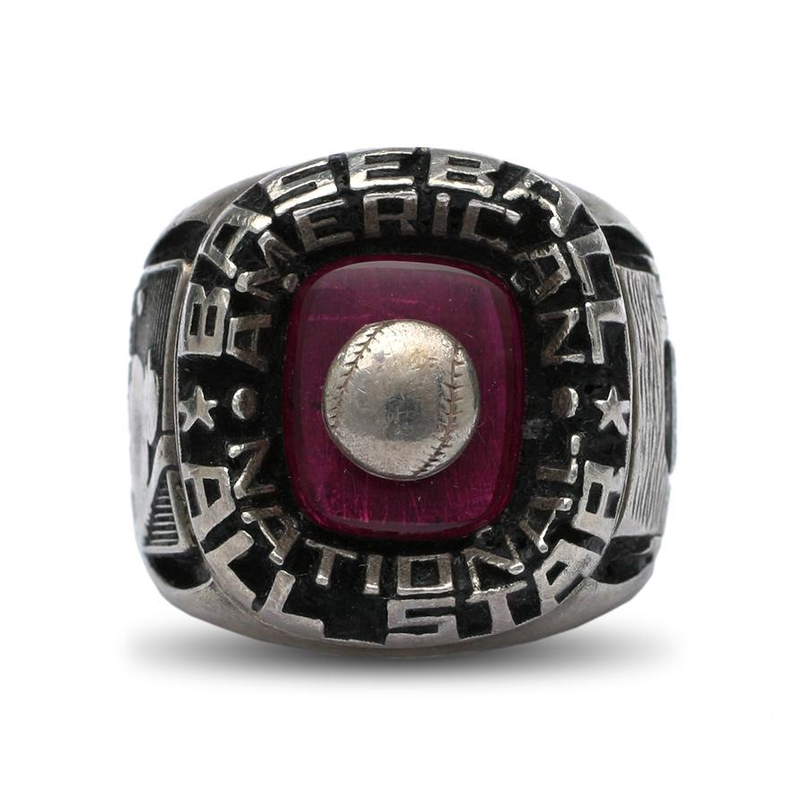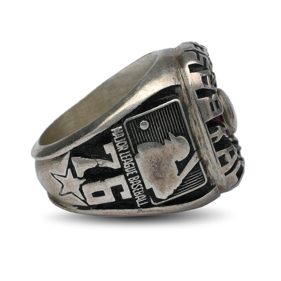 This size 8.5 ring says "All Star Baseball American National" around the center, which has a metal baseball in the center sitting on a flat ruby background. One side of the ring says, "Major League Baseball 76" while the other side has a picture of the Liberty Bell. The Major League Baseball All-Star Game was played at Veterans Stadium, home of the Philadelphia Phillies. The game resulted in a 7-2 victory for the NL. Honorary captains were Robin Roberts for the National League, and Bob Lemon for the American League.