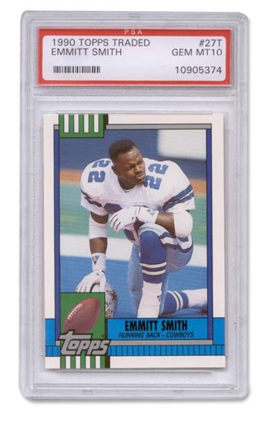 This is a gorgeous lot of (10) gem mint blaz-ers of Emmitt Smith's rookie. All (10) of these cards exhibit exceptional centering, razor sharp corners, and bright, vivid color. He holds the all time record for most rushing touchdowns. He is also less than a full sea-son away from breaking the all time rushing record held by Walter Payton. This is a great Emmitt Smith lot to put away until he is enshrined in the hall of fame.
