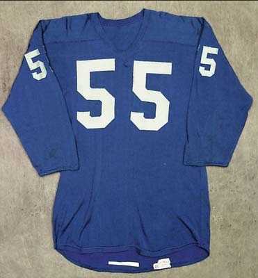 The fourth round pick for the Detroit Lions in the 1958 draft wore this terrific blue jersey in his earliest years in the N.F.L. Number "55" is on front, back and each sleeve in grey. "Griswold Sporting Goods [size] 48" tagging in tail. Nice use. Football jerseys from this era are really tough, and this is a fine example.