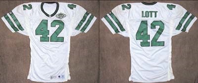 Road white mesh gamer shows fine use from this future Hall of Fame safety. Number "42" on chest, back and both sleeves, with "Lott" spanning the shoulders. Super Bowl III Twenty-Fifth Anniversary patch on upper left chest. Tail tag-ging is "Champion, Designed & Tailored Exclusively for New York Jets, 1993, [size] 48." Go Gang Green!