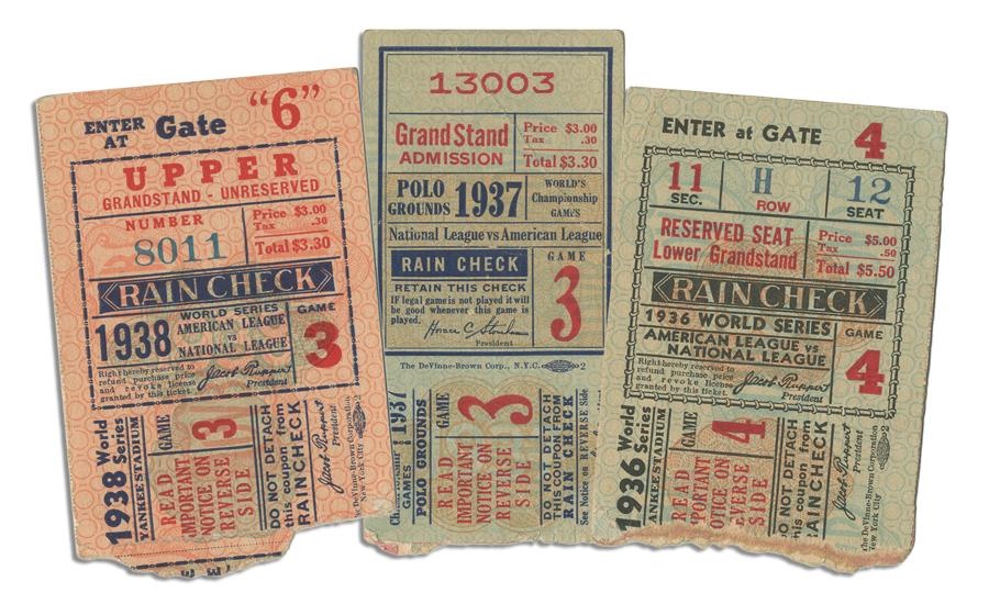 This lot includes three ticket stubs from World Series games; one each from the 1936, 1937 and 1938 World Series. The 1936 stub is from Game 4 at Yankee Stadium, where the Yankees defeated the New York Giants and went on to win the Series in six games. The 1937 stub is from the Game 3 at the Polo Grounds, where the Yankees again beat the Giants, this time going on to win the Series in five games. The 1938 ticket stub is from Game 3 at Yankee Stadium, where the Yankees defeated the Chicago Cubs and went on to sweep the Series. All three stubs are in terrific condition with the printing and graphics still clear and vivid.