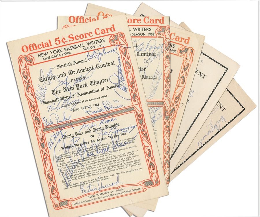 This lot includes a collection of five signed dinner programs/seating arrangements from New York baseball writers' events. There is both a program and a seating arrangement from the 34th Annual New York Baseball Writers "Eating and Oratorical Contest" held on February 3, 1957 at the Waldorf-Astoria Hotel in New York City. The four-sided program is signed by Mickey Mantle, Joe DiMaggio, Walter Alston, Ford Frick, Casey Stengel, Joe Cronin and Hank Greenberg; the 8-page seating list features the signatures of Yogi Berra, Mel Allen, Sal Maglie, Johnny Podres, Whitey Ford, Clem Labine and a dozen others. Next there is a program from the 36th Annual New York Baseball Writers dinner held on February 1, 1959; the four-sided program is signed by Hank Bauer, Ed Lopat, Ralph Houk, Elston Howard, Phil Rizzutto, Bobby Thomson, Joe Collins, Casey Stengel, Will Harridge, Willie Mays and many others. There is also a cover from the New York Baseball Writers 40th Annual dinner held on January 27, 1963. This two-sided document features the signatures of Brooks Robinson, Bob Purkey, Whitey Ford, Elston Howard, Jim Bunning, Ralph Terry, Yogi Berra, Clete Boyer, Moose Skowron, Jim Bouton and several others. Finally, there is a seating list from the Baseball Writers dinner on January 31, 1965 which has been signed by Mel Allen, Gil Hodges, Dal Maxvill, Jerry Coleman, Bob Aspromonte, Larry Jackson and several others. All of these programs measure 6 1/2 x 10" and all are in excellent condition. Over 60 signatures in all.