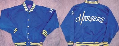 The Hall of Famer was a first round draft pick out of U.S.C. when he wore this great letterman style jacket on the sidelines of A.F.L. games. Great "Chargers" spans shoul-ders on back, and number "12" on left sleeve is just the number of the jacket (There was a limited supply, num-bered from one to about fifteen. They did not relate to jer-sey numbers). Wear is strong, but jacket still displays very well. "King O'Shea" tagging in collar. Acquired directly from Mr. Mix.