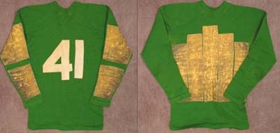 The most desirable style of early football jersey. Appealing green wool body is lightly "armored" with battle-scarred canvas strips meant to protect the wearer and repel potential tacklers. Number "41" in white felt on verso. Use is terrific, but despite a few tiny moth holes the condition is great.