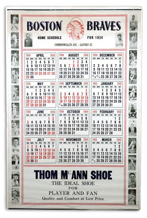 Large (25 x 38") poster-style 1934 calendar features the Boston Braves' 1934 baseball schedule. All along the sides are black and white photos of the Braves players, including Walter "Rabbit" Maranville, pitcher Tom Zachary (who gave up Babe Ruth's 60th home run) and manager William McKechnie pictured just above the actual calendar. Calendar has a metal strip along the top and Thom McAnn advertising at the bottom. This is the first of its kind we have seen. Minor tearing, but overall EX.