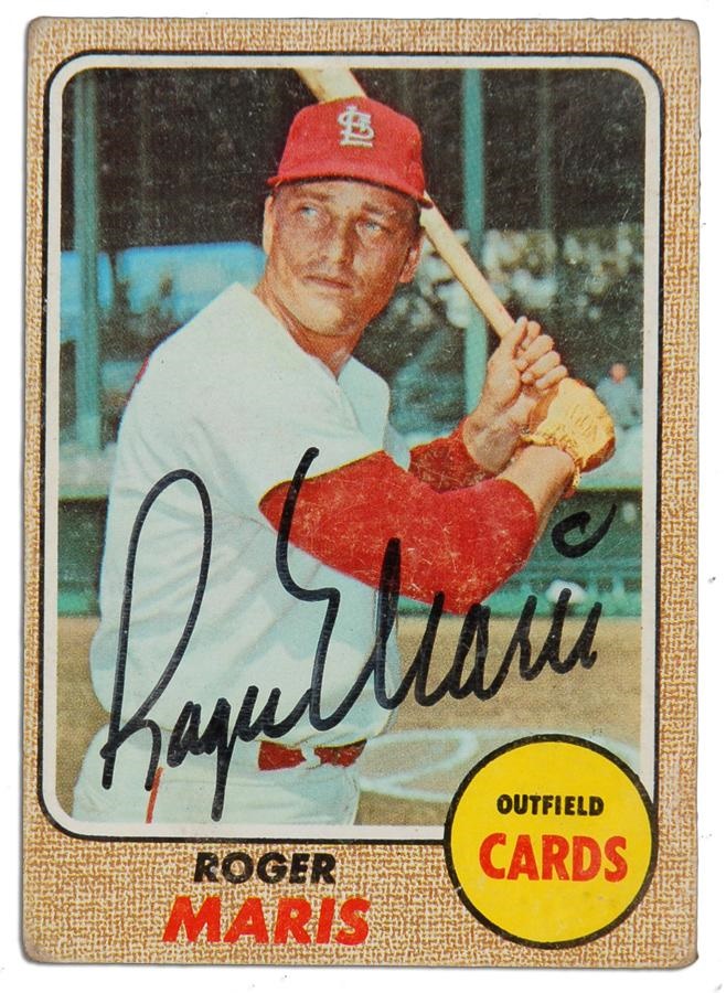 1968 Topps Roger Maris baseball card signed in black sharpie by Maris himself. The card is in EX condition, and is mounted under plexiglass on a wooden plaque measuring 4 1/2 x 6 1/2". Signature grades 8-9/10.