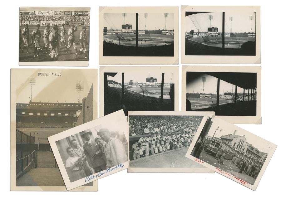 The nicest baseball snapshot collection we have ever offered. Best of all many are signed! 23 of the 122 are vintage signed. Signed players includes Southworth (2) and Sain. Best are the unsigned. Highlights include Jim Tobin’s 1944 no-hitter (4), 1944 Red Sox-Braves City Series (2), 1938 Cubs (2), 1932 spring training at St. Pete, 1939 Crosley Field, Brooklyn at Braves Field July 1942,1948 Braves-Pirates, and an amazing series of Braves Field (some larger size than snapshots), 1948 World Series with great trolley car, 1914 Miracle Braves Reunion (1951), there is even some early color. EX.