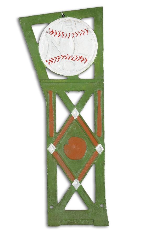 Metal figural side from a stadium seat at Braves Field, this is indeed a beauty. Roughly 5 1/2" at the bottom, 16 1/2" high and 8" at the top, the piece features a baseball with a raised NLBC (National League Baseball Club) in white, a baseball diamond with a glove in the center and two bats at each side above, and three holes where it was attached to the stadium seat. The original paint is in great condition and quite rare. Unique addition for your Boston or vintage stadium collection.