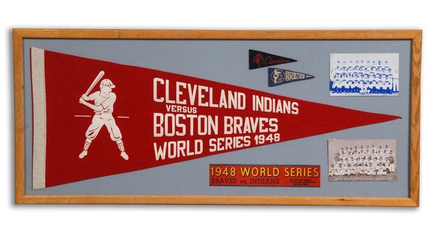 This lot consists of a rare 29" red felt pennant reading "Cleveland Indians versus Boston Braves World Series 1948" that has been mounted in a framed display along with a 4" black felt Cleveland pennant, a 4" blue felt Boston Braves pennant, two 5 1/2 x 3 1/2" exhibit cards picturing the 1948 National League Champion Boston Braves and the 1940 World Champion Cleveland Indians, and a color caption entitled "1948 World Series." This attractive collectible piece measures 32 x 14" and is in EX-MT condition.