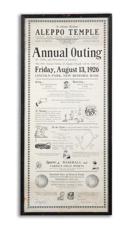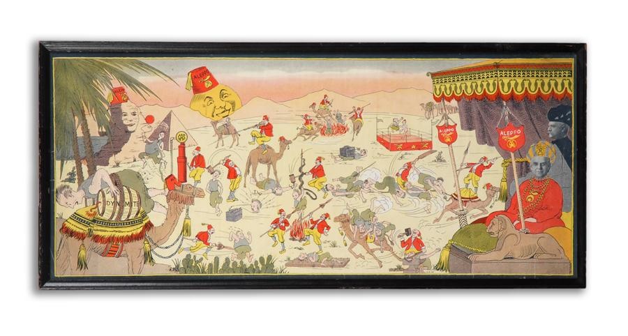 This beautiful two-sided poster features a color lithograph of cartoon-like Middle Eastern scenes featuring camels, pyramids and the Aleppo Shriners committing mayhem in their distinctive red fezzes. On the other side, a black and white poster advertises a series of Aleppo Temple events including "Baseball Day at Braves Field" on August 5, 1926 when the Boston Braves would take on the World Champion Pittsburgh Pirates (and the Aleppo Temple Drum Corps was to furnish the music). This piece measures 13 x 28 1/2" in its original frame and is in excellent condition.
