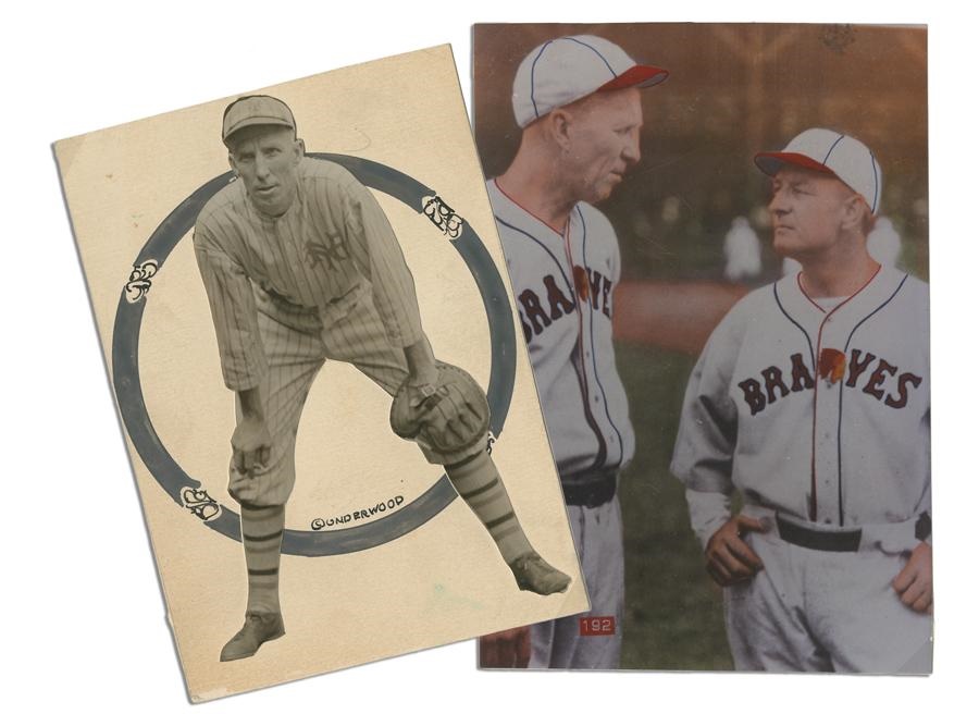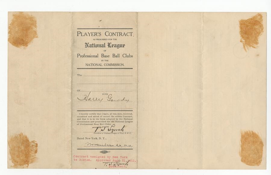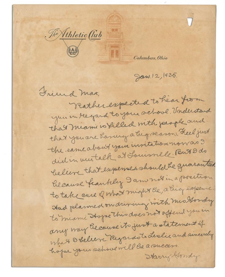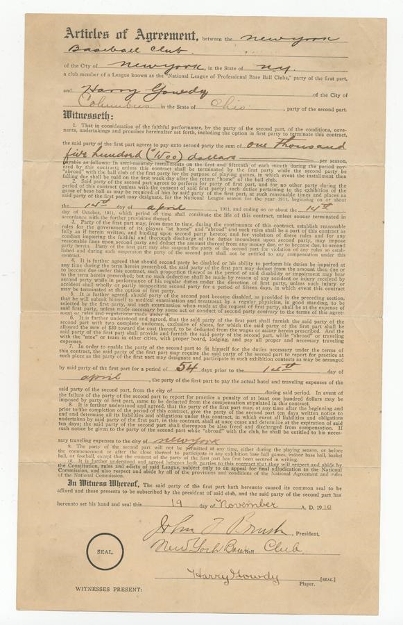 Two marvelous pieces relating to this beloved Brave. 1) Handwritten letter to HOFer Max Carey regarding his baseball school. Signed “Harry Gowdy” on Athletic Club of Columbus, Ohio stationery (1935). 2) 1910 New York Giants contract is signed by Harry Gowdy, twice by National League Pres T.J. Lynch and by legendary NY Giants owner John T. Brush. EX.