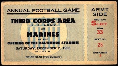 The "Annual Football Game" between the Army and the Marines christens the "Opening of the Baltimore Stadium." What great moments in sports history would follow. Large and impressive stub is strong VG-EX.