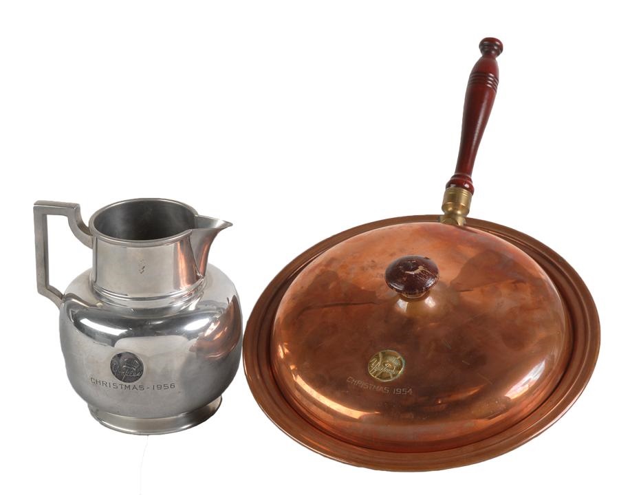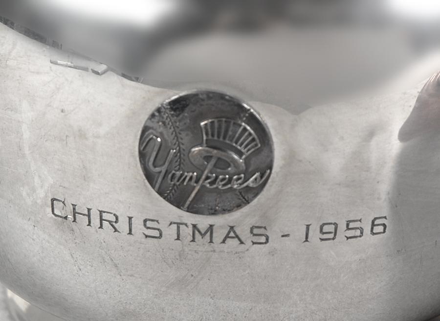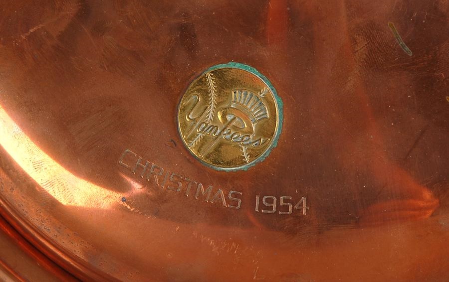This group includes a pewter pitcher with the Yankees logo in the center. Under this it is engraved with "Christmas - 1956", which was Mickey Mantle's MVP season. The second piece, a frying pan with a lid, says "Kent Kopperware by Lehman" underneath. This has the same Yankees logo in the center as the pitcher, and has been engraved with, "Christmas 1954".