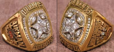 Enormous and gaudy salesman's sample proves that everything truly is big in Texas. Lone star at center of face is set on a field of faux diamond studs and surrounded by the raised text, "Dallas Cowboys." Left shank has "Aikman" arching above an "NFL" logo and the score, "27- 17." Right shank reads, "World Champions, 71, 77, 92, 93, 95" with five miniature Lombardi Trophies and the logo of Super Bowl XXX. Size 12.