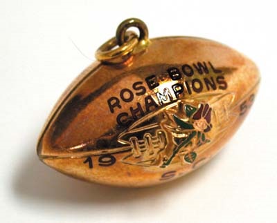 Small in size (1.25"), but not in importance, this miniature gold football charm was awarded to a victorious college gridiron hero from South Carolina. Red embossed lettering reads, 1953, Rose Bowl Champions, S.C." Condition is perfect. Wear it as a necklace pendant, or just put it on display to make your friends jealous. NRMT.
