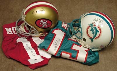 Lot includes Joe Montana signed San Francisco helmet and jersey and Dan Marino Dolphins signed helmet and kersey. All come in their original and attractive Upper Deck Authenticated boxes. All come with UDA certificates of authenticity except for the Montana jersey which is missing. This can be reissued by UDA if sent in (responsibly of the buyer). Mint.
