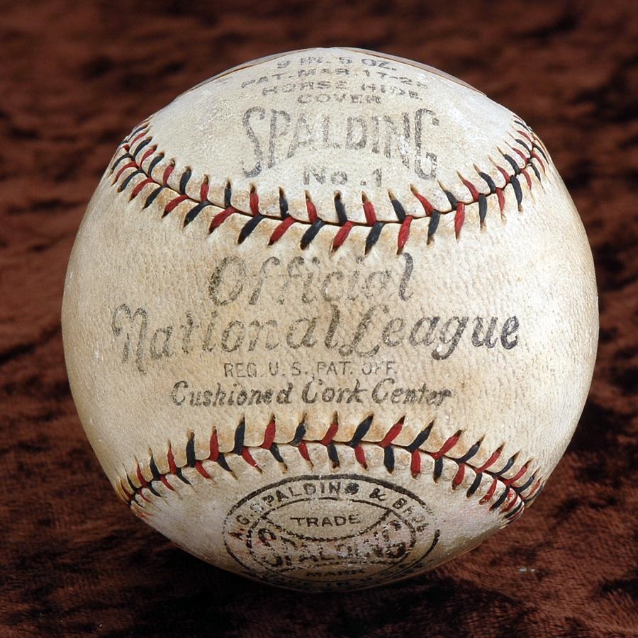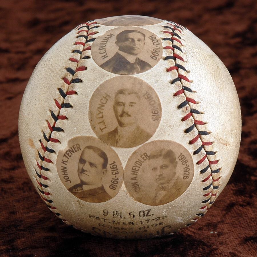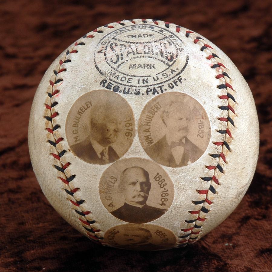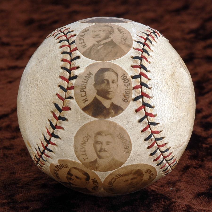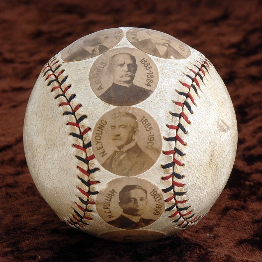 We offer here a vintage Official National League 50th Anniversary Golden Jubilee baseball. Presented to those who attended the league's 50th anniversary celebration on February 2, 1926 at the Hotel Astor in New York, the ball is adorned with eight sepia-toned portraits of the past National League presidents, including their dates of tenure. Both the ball and the photos are in excellent condition; only two of the photos have small chips on the edges that do not affect either the photos or the lettering. This ball is truly a unique collectible.