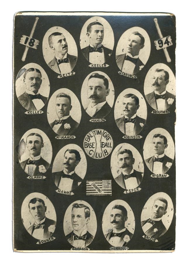 Magnificent display photo of these Temep0le Cup competitors at their finest. Stirring cornucopia of ovals feature such legends as Hanlon (center), Gleason, Clarke, Kelley, Robinson, Brouthers, Jennings, Keeler, and more. 100% vintage original is one we have not seen before. Mounted on heavy board it is overall excellent other than some wear to the edges and a crease on the back mount that does not go through to the photograph. Publishing notes on the back as well. 13.5x9”.