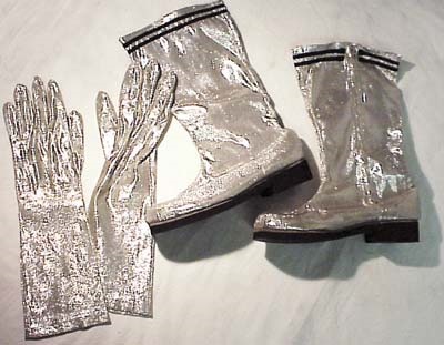 A fabulous set worn by Robin Williams as Mork from Ork on the hit television series Mork & Mindy. Magnificent sil-ver sparkled boots have black piping, black bottom and zippered sides. Matching gloves include a hole to accommodate a finger to do the "Nano Nano" catch phrase. The set comes with a letter of authenticity from a top Hollywood casting director who received these for a charity auction. EX+.
