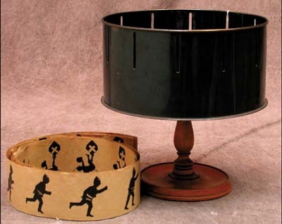 Early motion picture device consists of a wooden base, a tin cylinder and six different two-sided 3x29" paper inserts, or the "movies." When the Zoetrope spins, it emulates movement, which helped to inspire the invention of the motion picture cam-era and projector. Francis Ford Coppola named his illustri-ous film production company after this important early invention. EX+.