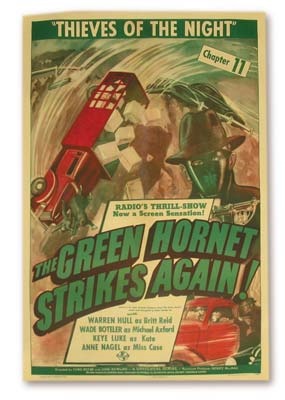 Dynamic graphics adorn this 1940 "superhero" classic based on the pop-ular radio program of the day. Pictures extraordinary graphic that is a pure cliffhanger itself. This is for Episode 11, "Thieves of the Night." Warren Hull starred in one of the top movie serials of all-time. NRMT on linen. 27x41".