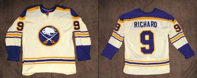 Nothing can beat those old Seventies tie-necks. Pristine dureen home uniform of the Buffalo Sabres worn by cen-terman Jacques Richard during the period of 1975-1977. Tagged in the collar with a red Rawlings label, size 48. Early style tackle twill white nameplate with blue lettering. Loop fightstrap in the tail with original string in the neck. Light wear with a few stick marks. From the collection of a former Sabres trainer.