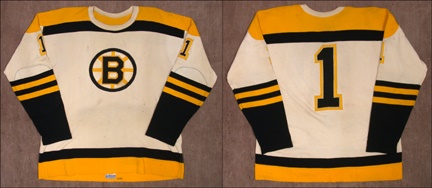 Fabulous light wool bruins sweater from the early to mid Sixties worn by netminder Ed Johnston. The tackle twill spoked Bruins logo sits high on the chest with the num-ber "1" on the back and sleeves. Tagged in the hem by Wilson Sports Equipment with size "50" in red above an additional tag reading "Jim McCarthy Athletic Equipment, Sommerville, Mass.". Nice wear for a goaltender's uni-form with two larger circular team repairs and a few smaller ones. Original Six!