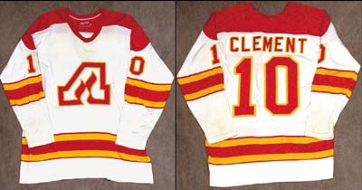 Mid to later Seventies heavy Rawlings dureen jersey with sewn on crest, numbers and letters in the home scheme of the defunct Atlanta Flames franchise. Two-tone num-ber "10" with a restored "Clement" nameplate across the back shoulders. Scattered stains, pulls, marks, pilling and one good team repair on this one.