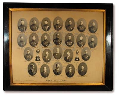 Twenty-four remark-ably clean and perfect vintage portraits of these athletes from north of the border are joined together here to form a truly dignified display. Each player and/or executive is identified in hand-drawn calligraphy, with footer reading, "Hamilton Tigers, Canadian Champions 1906." Some water staining at bot-tom does not extend more than two inches from bottom and does not touch the photography at all. Othrwise the condition is much as it was in the early part of the twenti-eth century, including the great original wooden frame.