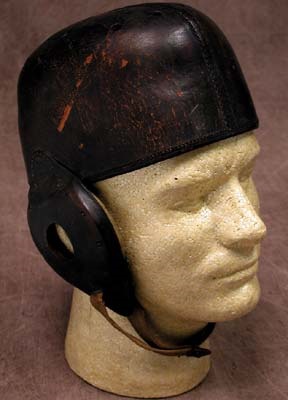 Spectacular and ultra-rare specimen is one of the very earliest commercially made pieces of gridiron head-gear. Note the rare "bowl" shape of the crown, and the fine "Wright & Ditson" stamping above each earflap. Patent stamp sets the date. Condition is splendid, with only the expected wear of age and no tearing or staining. Even the original chin strap is here!
