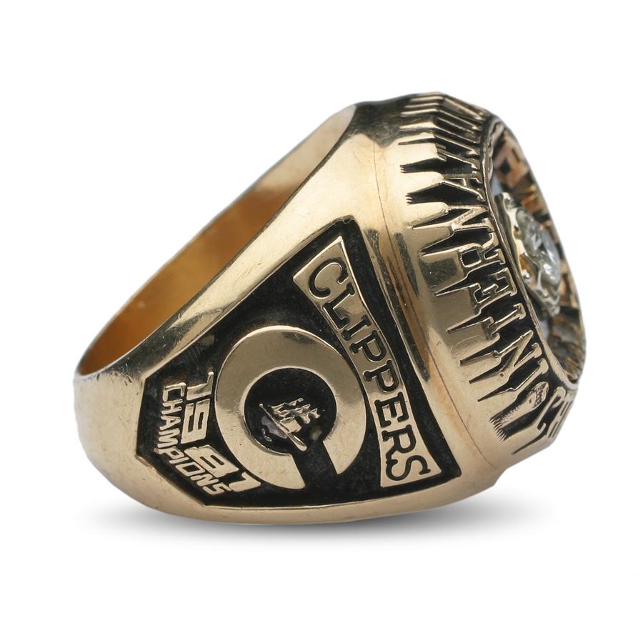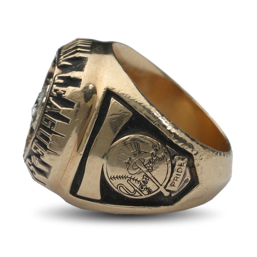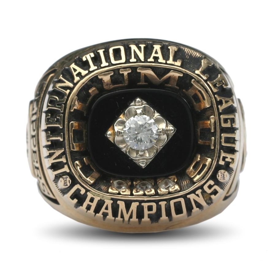 This ring was presented to members of the 1981 International League Championship-winning Columbus Clippers. Made by Jostens, the ring is stamped 10KP on the inside. The top of the ring sports a small diamond in a diamond-shaped setting on a black background with three diamond chips below. "Columbus International League Champions" in raised lettering appears around the top of the ring. The right shank has the Yankees logo in gold (the Clippers are a Triple A Yankees affiliate) and the left shank has the Clippers logo with "Clippers 1981 Champions" also in gold. Ring is size 10.