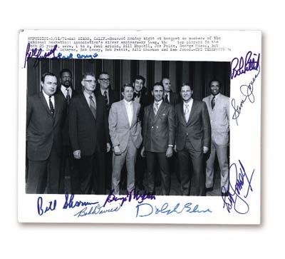 Signed by Russell, Mikan, Cousy & More Silver Anniversary wire photo is signed by nine greats of the game: Russell, Mikan, Pettit, Davies, Sharman, Sam Jones, Arizin, Schayes and Cousy. Snapped at a San Diego, California banquet. Photo show a little wear, but signatures are unaffected and all 9+/10. COA. 8x10".