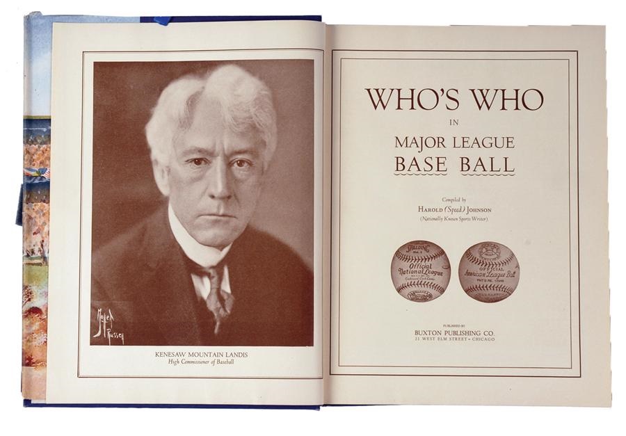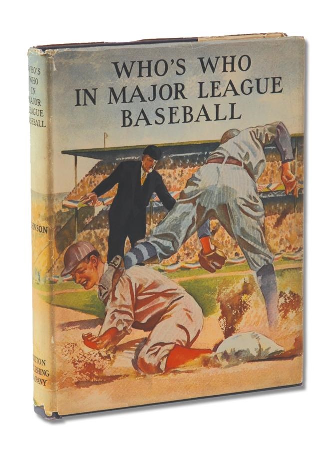 This copy of "Who's Who in Major League Baseball" was published in 1933 by Buxton Publishing Company in Chicago. It was compiled by Harold "Speed" Johnson, and features some greats inside. There are some rips and/or tears on the jacket, but otherwise the book is EX.