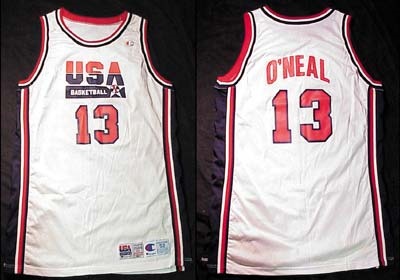 Patriotic red, white and blue gamer was worn by the tremendous hardcourt superstar as he represented the United States in Toronto at the World Championship of Basketball. Lucky number "13" adorns chest and back below "USA Basketball" and "O'Neal" respectively. Nice use shows that Shaq didn't take the competition lightly. Tail tagging: "Champion USA Basketball, Designed & Tailored Exclusively for 1994 World Championship of Basketball, Toronto, [size] 52." Obtained from Shaq's agent, with LOA.