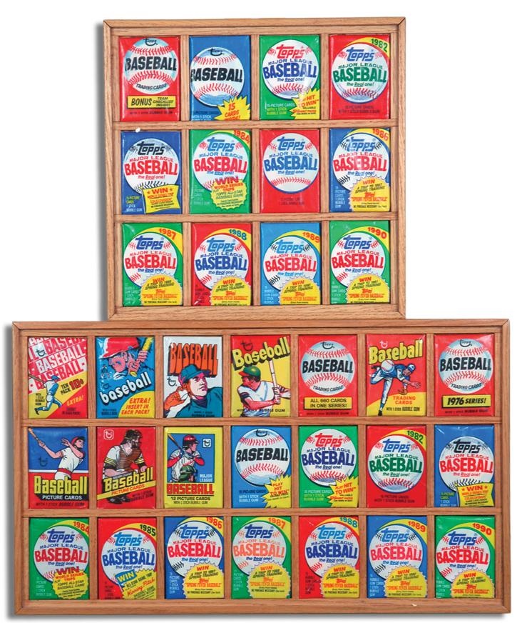 Framed collection of unopened Topps baseball card packs in two separate frames. The first frame measures 22 x 13" and contains 21 card packs; one from each year from 1970 through 1990. The smaller frame measures 13 x 13" and contains 12 card packs from the 1980s through 1990; there are packs from 1982, 1984 and 1986 through 1990 along with several packs that don't have the year printed on them. The baseball card packs are all unopened and are NRMT.