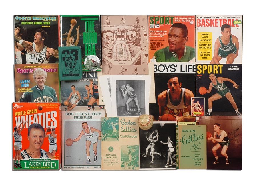 This collection brings a total of over 180 pieces to the sports fan. It includes many great fan pieces from the 1950's Celtics days, to the Larry Bird era, to today. Some of the highlights include: a rare 1952 Clinic program, rare B. McKinney real photo advertising postcard, scarce Larry Bird material, collection of Bill Sharman memorabilia including a signed baseball from the 1955 St. Paul Saints, nice magazines from the 1950's (two signed by Havlicek), scarce 1961 Basketball HOF Commemoration Day program, 1950-'51 Philadelphia Warriors souvenir photo, 1957-1958T basketball cards including Bill Sharman, Zollner Pistons press photos, programs including playoffs and Bob Cousy Day, a picture pack in its original envelope, a rare 1964 Kiwanis program, and an extremely hard-to-find 1951-1952 Celtics media guide (precursor to the yearbook). Overall EX to EX-MT.