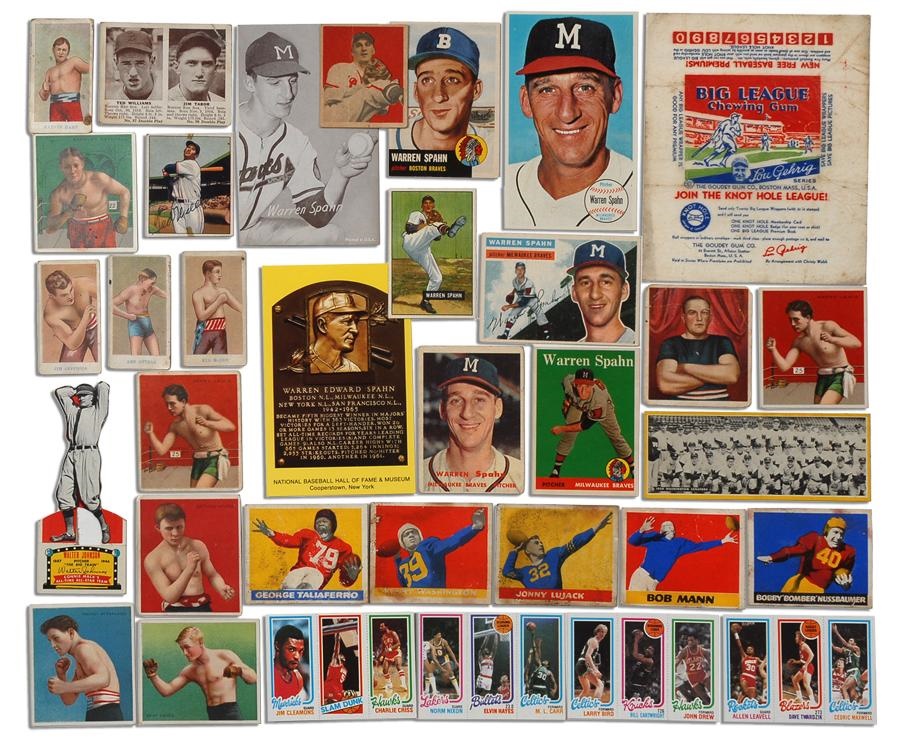 Over 4,000 cards includes some great stuff. This lot is especially heavy on Red Sox players. It includes: a nice Warren Spahn collection with a 1953 and 1954T (both NRMT), good groups of little player collections with multiple rookie cards of each (Roger Clemens, Mike Greenwell, Bobby Doerr, Jim Rice, Wade Boggs, Don Mattingly), unopened packs including 1974T baseball, a group of 1950 and 1951 Bowman cards (100+), Star Cal Decals, 1960s Topps inserts, exhibits, 1951T redbacks, 1934 Goudey wrapper, 1951T Washington Senators team card, Ted Williams vintage signed 1950B, 1948-49 Leaf football, early boxing, Ted Williams 1941 Double Play, 1970's - 1980's basketball wax packs, 77-78 and 80-81T basketball sets, and much more. Overall EX.