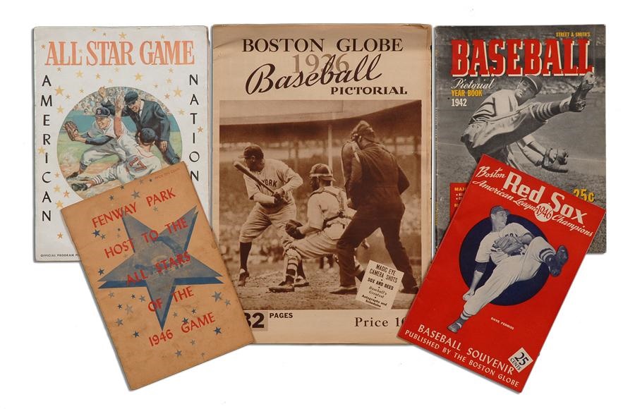 Very eclectic group with emphasis on Boston includes: 1946 Red Sox “yearbook” with huge foldout poster EX-MT, 1946 All Star program (VG), 1961 All Star program (VG), 1911 Spalding Guide (Good), 1936 Boston Globe Pictorial with Babe Ruth cover (Great! EX-MT), Street & Smith Baseball Yearbooks (1942, 1944 and 1945 overall EX), seventeen 1920s-40s Baseball Magazines (overall VG-EX, great covers & Bill Terry 3x5). Even a Ripken 2000th game unused ticket. Total of 37 pieces.