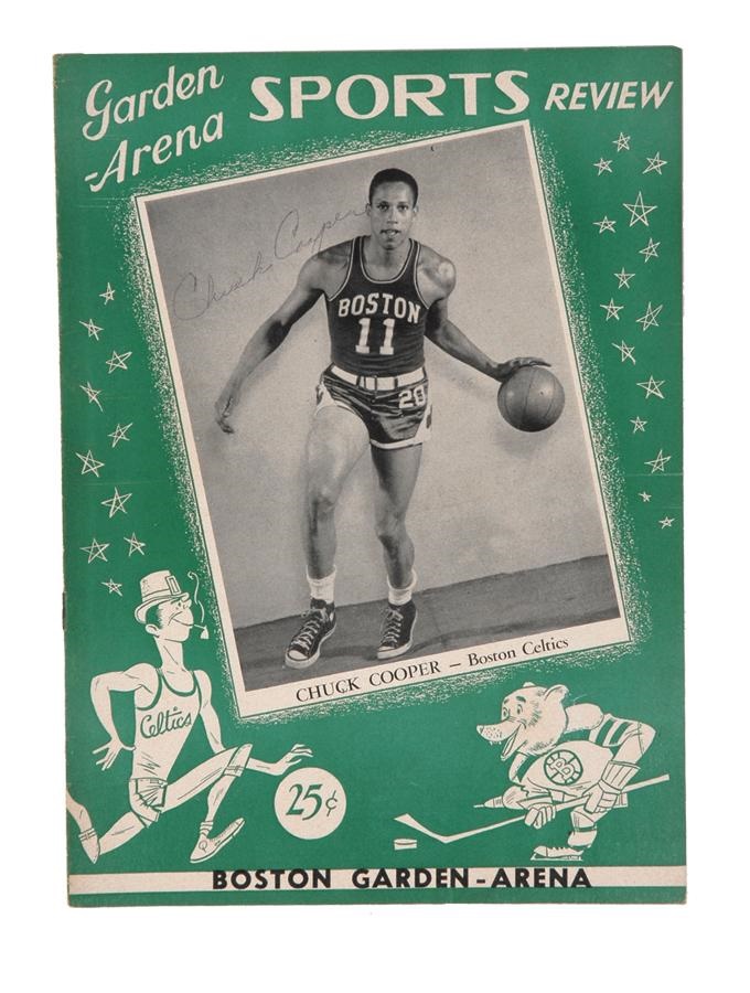 This copy of the Garden Arena Sports Review has been signed in ballpoint pen by Chuck Cooper of the Boston Celtics. In 1950, Cooper was the first black player to be drafted by an NBA team. Cooper was signed by Celtics coach Red Auerbach.