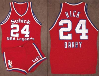 A game worn uniform from his playing days will set you back more than most of us are willing or able to spend, so here's a fine alternative. This red, white and blue ensem-ble was worn by the Hall of Fame legend as part of the "Schick NBA Legends" team. Back of jersey has "Rick Barry 24" in white and blue; shorts have "N.B.A." logo and "East." Tagging is from "Medalist Sand-Knit," with jersey and shorts being size 42 and 32 respectively. Very light use is to be expected for a one-game uniform.