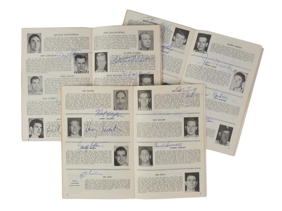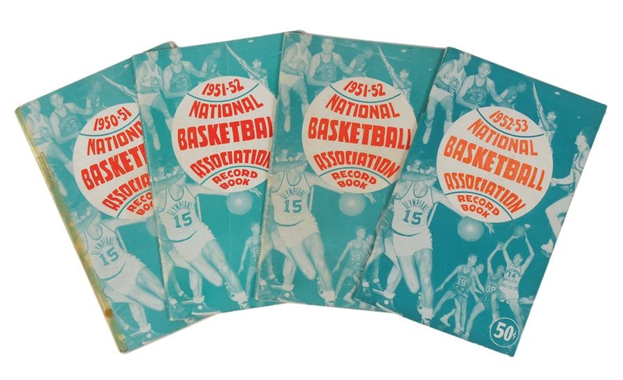 These four signed record books from the NBA have over 120 signatures which include: Chuck Cooper, Red Auerbach, Bill Sharman, Vince Boryla, Paul Arizin, Eddie Gottlieb, Bob Cousy, Joe Lapchick, and Nat Clifton. One book is from 1950-1951, two are from 1951-1952, and the last is from 1952-1953. In the 1952 NBA Finals, the Minneapolis Lakes beat the NY Knicks 4-3, and the next year beat the Knicks 4-1. These record books include season player records, records for playing arenas, game scores, team rosters, and player sketches with photos and narratives.