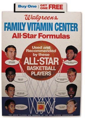 You won't find any pro athletes today allowing themselves to be publicly associated with drugs, but these were different times. Jerry West and Kareem Abdul-Jabbar are just two of the hardcourt heroes pictured on this EX-MT counter top sign. Easel back. 20x29".