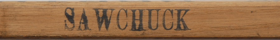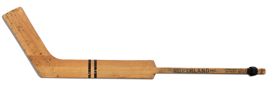 This Northland Pro hockey stick was used in the 1960's by Terry Sawchuk, and then by another goalie. This is evident because about 12" has been cut off of the top of the shaft. The original tape has been removed from the paddle, which has several small cracks on it. Numerous puck marks cover the paddle, also. Sawchuk is known by many as the "best goalie ever" in the NHL. He played in 21 seasons with five different teams, and his 103 career shutouts set a standard for future goalies. Playing hockey allowed Sawchuk to escape his deeply troubled life filled with untreated depression, alcoholism, physical pain from injuries, and sickness. His tenacity and plays on the ice made him a goaltender who will be remembered by hockey fans for generations to come.