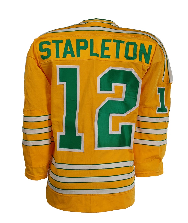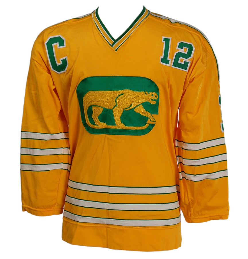 Immaculate piece of WHA history featured here in a game issued Pat Stapleton Chicago Cougars jersey. Finely detailed Cougars crest with the cougar chain-stitched onto the green twill background. Stapleton’s #12 and Captain’s “C” sit proudly on the front chest. Stapleton’s #12 is sewn onto the sleeves and back in two color tackle twill. Stapleton’s name sits above the back number sewn onto a name-length twill nameplate. “73” year tag sewn inside the back right hem. Wilson size 48 tag in the collar. Mint condition durene jersey.