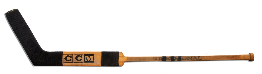 This Professional CCM hockey stick was used in the 1960's by goalie Johnny Bower, who helped the Maple Leafs win three consecutive Stanley Cups in the early 1960's. The stick has its original tape on the butt end and appears to have been re-taped on the paddle, which has no cracks and just a few minor chips on it.