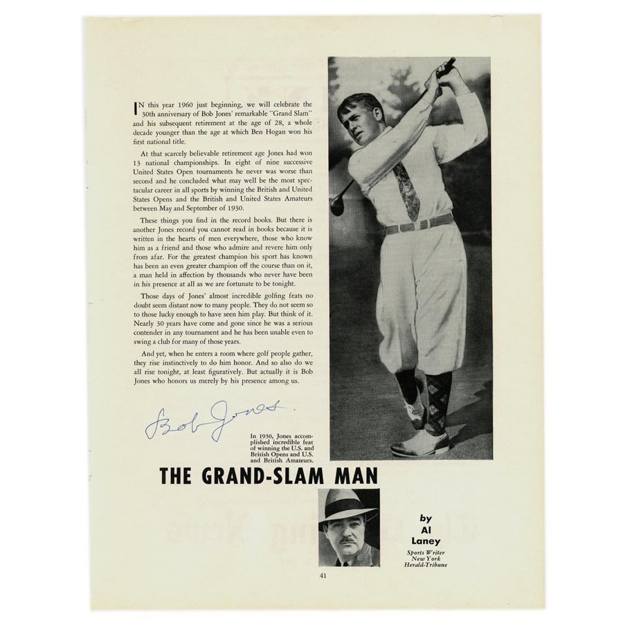 This page from The Sporting News magazine, circa 1960, features a short article about golfing legend Bobby Jones by sportswriter Al Laney, a photo of Jones in his follow-through, and Jones' signature in blue ink. The article commemorates the 30th anniversary of Jones winning golf's "Grand Slam" at age 28, and praises Jones as an individual who was not only a champion golfer, but a respected and revered human being. A must for the golf aficionado. PSA LOA.