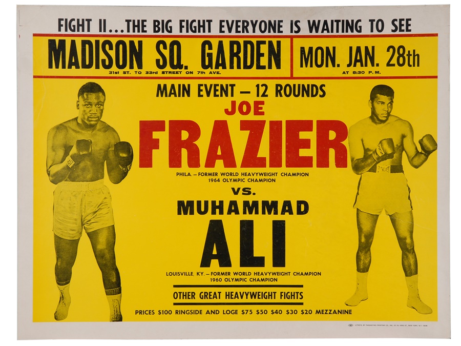 This 23x30" poster reads, "Fight II...The Big Fight Everyone is Waiting to See, Madison Sq. Garden, Mon. Jan. 28th at 8:30 P.M.". It says that the main event was for 12 rounds, and featured Joe Frazier vs. Muhammad Ali. Ali got his revenge winning a decision. This original on site poster is cardboard. Bold images of the fighters. Bold color. Crease in upper left corner. Minor restoration on the border. Generally clean. Passantino Printing Co. logo in lower right corner. Scarce poster from their second fight.