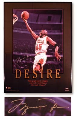 The most dominant figure in his sport drives for the hoop in an inspirational look at the Bulls great. Silver sharpie signature is perfect 10/10. Upper Deck authenticated with all pertinent paperwork. 24x30" framed.